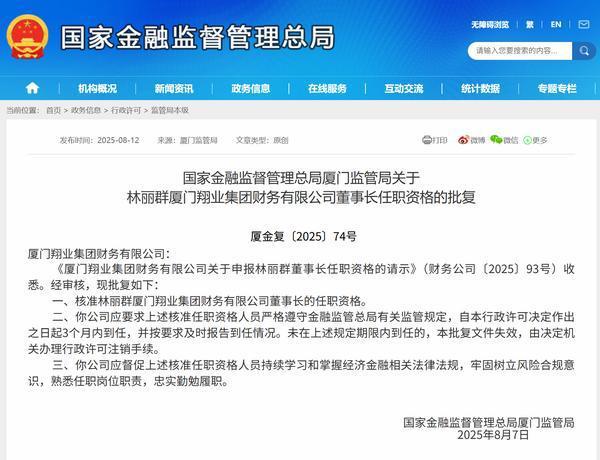 中国网财经8月13日讯昨日,国度金融监督处理总局厦门监管局公布关系批复,核准林丽群厦门翔业集团财务有限公司(简称“翔业集团财务公司”)董事长的任职履历。以下是关系批复正文: